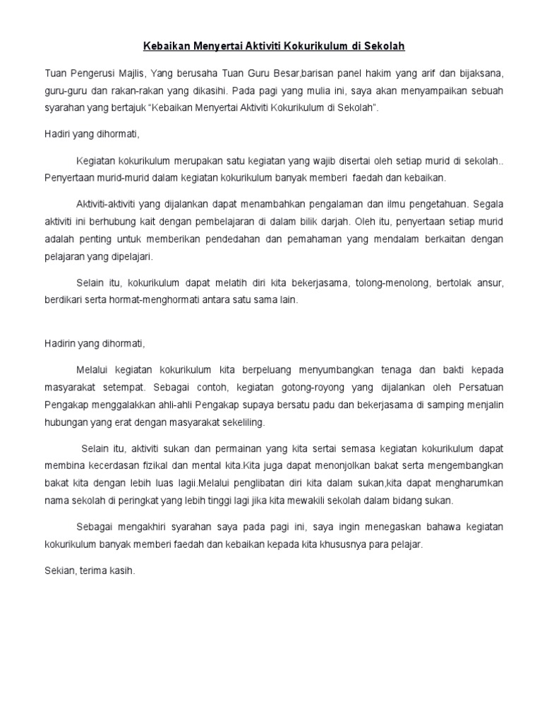 Kesimpulannya aktiviti kokurikulum adalah sangat penting kepada semua murid. Dalam hal inipara pelajar berkemungkinan bebas daripada masalah obesiti yang dialami oleh sesetengah remajaSebagai buktiperangkaan yang dikeluarkan oleh Jabatan Kesihatan di. Selamat pagi dan salam 1 Malaysia saya ucapkan kepada Tuan Pengerusi Majlis barisan panel hakim yang arif lagi bijaksana penjaga masa guru-guru dan rakan-rakan sekalianBerdirinya pokok kerana akarnya berdirinya rumah kerana tiangnya tetapi berdirinya saya di sini adalah untuk.