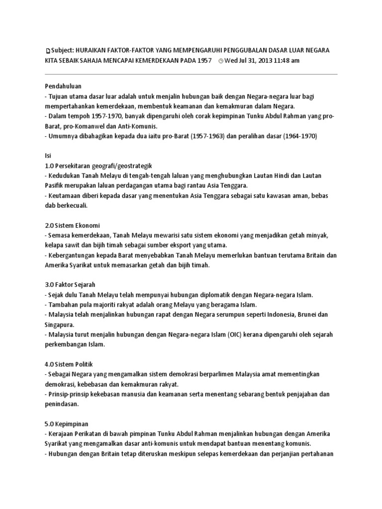 SEJARAH KERTAS 3 SPM 2016 1. Keutamaan dasar luar malaysia walaupun mempunyai dasar luar yang mantap negara ini bebas membuat hubungan dengan semua negara. 5 Markah Dasar tersendiri.