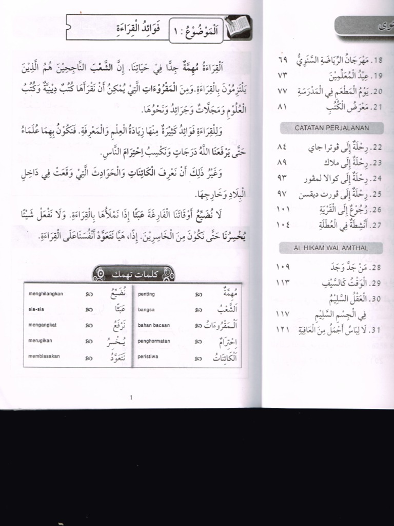 Ya Allah kami memohon kepadaMu keselamatan dalam agama dan kesejahteraankesegaran pada tubuh dan penambahan ilmu dan keberkahan rizqi serta taubat sebelum mati dan rahmat di waktu mati dan keampunan sesudah mati اللهم هون علينا فى سكرات الموت والنجاة من النار والعفو عند الحساب. Soalan disediakan dengan pelbagai jenis dan berperingkat- peringkat daripada yang mudah kepada yang sukar. الـمقرأ tempat meletakkan kitab waktu membaca.
