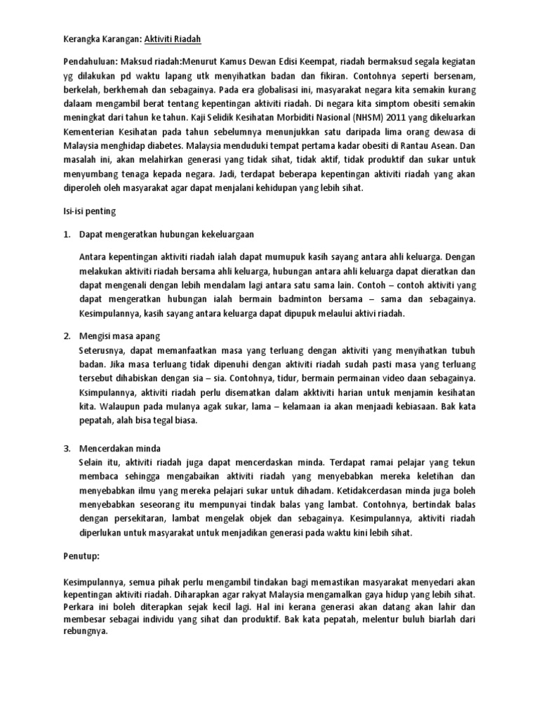 Semangat tolong-menolong dan kerjasama akan menambah keseronokan sesebuah keluarga ketika beriadah. Panduan menulis karangan spm kertas 1 bahagian a untuk karangan spm bahagian a isi selalunya telah diberikan dalam bentuk grafik atau bahan ransangan. Karangan Kepentingan Aktiviti Riadah.