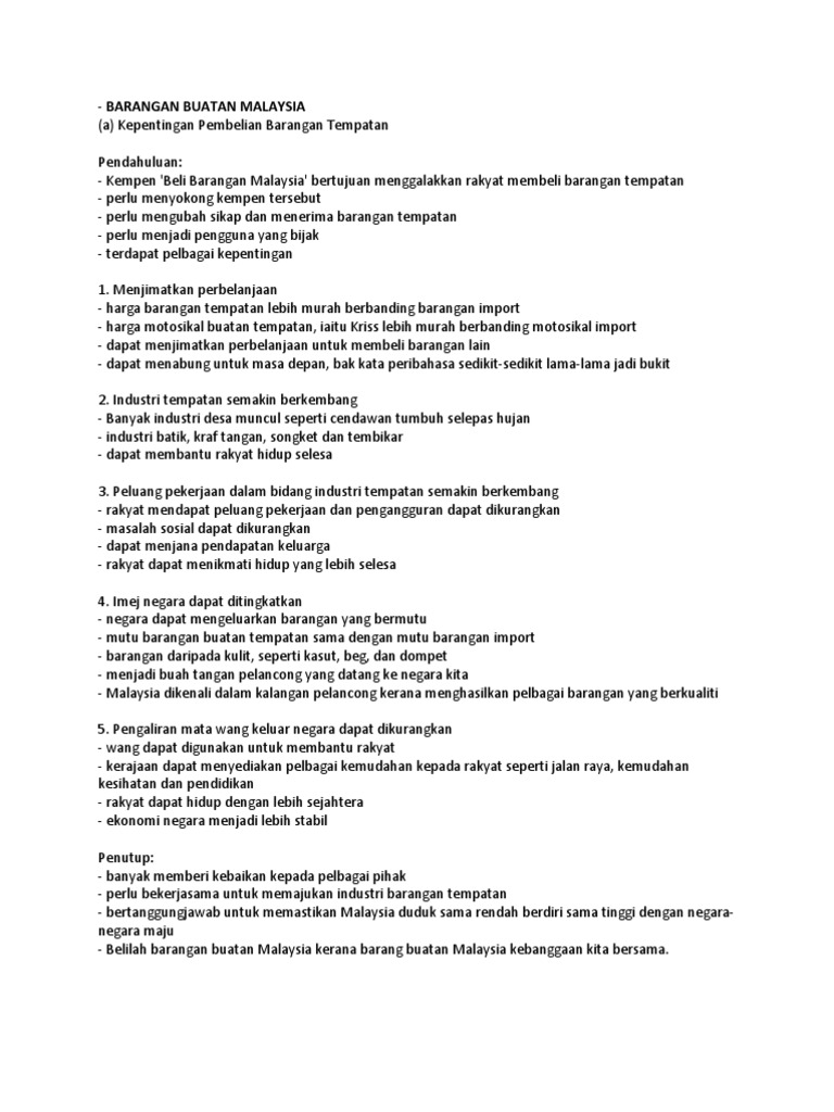 Karangan Kebaikan Membeli Barangan Buatan Malaysia. Hal ini kerana kita sebagai rakyat Malaysia akan menerima pelbagai kebaikan dan faedah bagai menyelam sambil minum air sekiranya kita membeli barangan buatan Malaysia. Namun di sebalik kemajuan tanah tumpah darah ini terdapat.