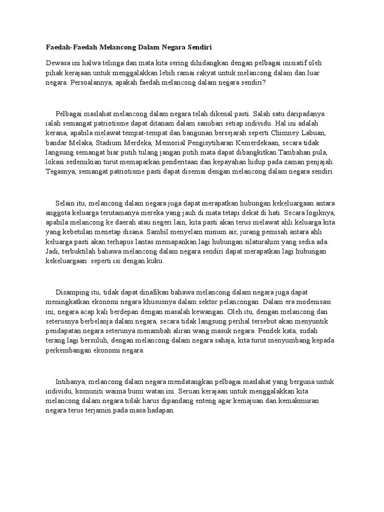 Dengan melancong kita dapat merehatkan fikiran dan tubuh badan. Contoh Karangan Kepentingan sektor industri pelancongan kepada rakyat dan negara Pendahuluan. Pelancongan dianggap sebagai satu industri yang menguntungkan negara.