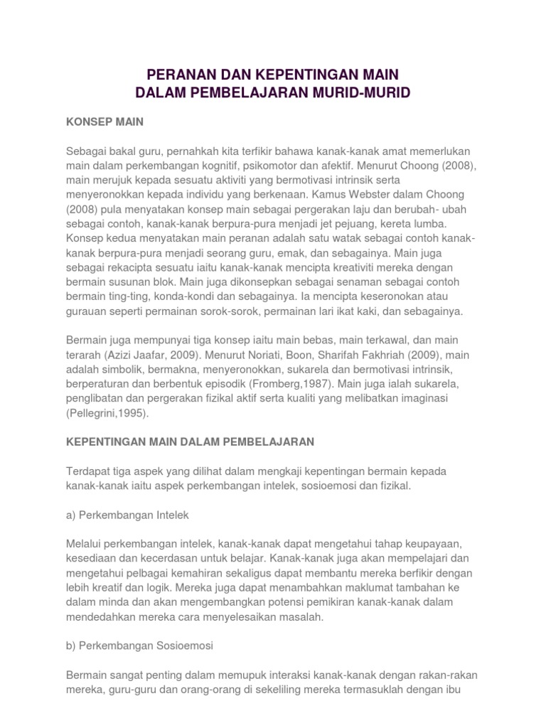 Setiap kanak-kanak akan menguasai pelbagai kemahiran kognitif yang penting termasuk pemikiran kritis penaakulan pemikiran kreatif dan inovasi Pelan Pembangunan Pendidikan Malaysia 2013-2025 2013 hlmE9. Hakikatnya bermain merupakan satu kaedahcara yang paling berkesan untuk menggalakkan pembelajaran anak-anak. Bermain adalah aktiviti penting dalam zaman kanak-kanak.